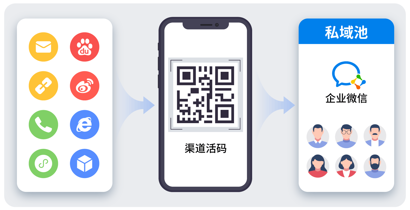 合力億捷提供多種引流獲客方式,如:一鍵添加企業(yè)微信、渠道活碼、短鏈接等,快速聚集官網(wǎng)、抖音、直播等全渠道客戶,引入到企微私域流量池,實(shí)現(xiàn)高效獲客、觸客、聚客。