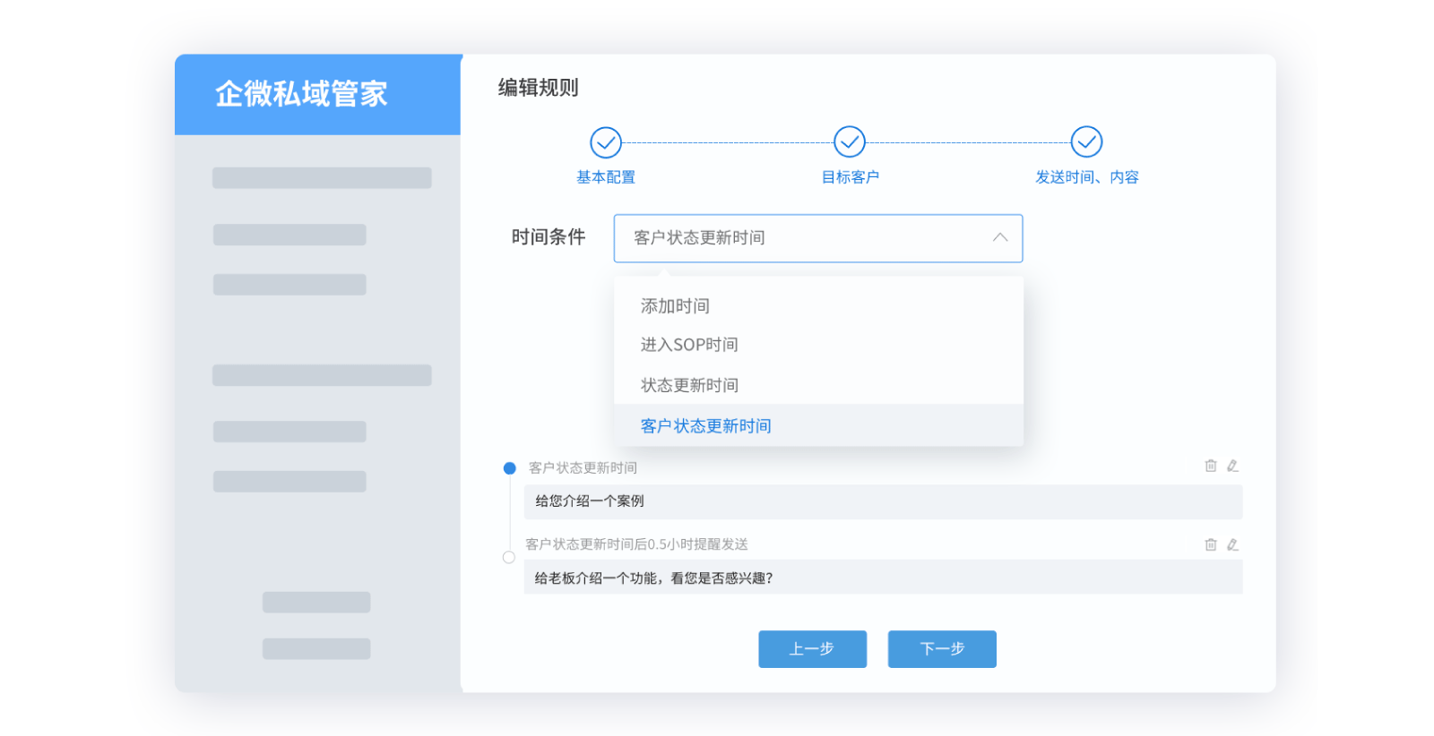選定執(zhí)行人,制定觸發(fā)機(jī)制,當(dāng)?shù)竭_(dá)觸發(fā)時(shí)間,銷售人員就會(huì)自動(dòng)收到SOP任務(wù)提醒,一鍵點(diǎn)擊即可完成SOP內(nèi)容推送;當(dāng)有客戶對(duì)發(fā)送內(nèi)容有反饋時(shí),系統(tǒng)會(huì)根據(jù)客戶的相應(yīng)動(dòng)作進(jìn)行打分,達(dá)到一定分值就會(huì)進(jìn)入下一階段SOP孵化。并且結(jié)合數(shù)據(jù)雷達(dá),當(dāng)客戶培育孵化到意向階段時(shí),實(shí)時(shí)提醒銷售跟進(jìn),促成客戶成交。